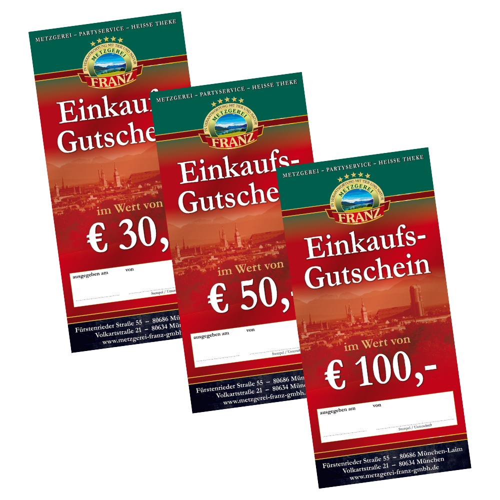 Ob zu Weihnachten, zum Geburtstag oder zur nächsten Grillparty - mit einem Gutschein von der Metzgerei Franz bist du auf der richtigen Seite. Du kannst zwischen unterschiedlichen Beträgen wählen. Wir versenden deinen Gutschein innerhalb von 24h mit der Post als Brief. Somit steht dem nächsten Geschenk nichts im Wege.